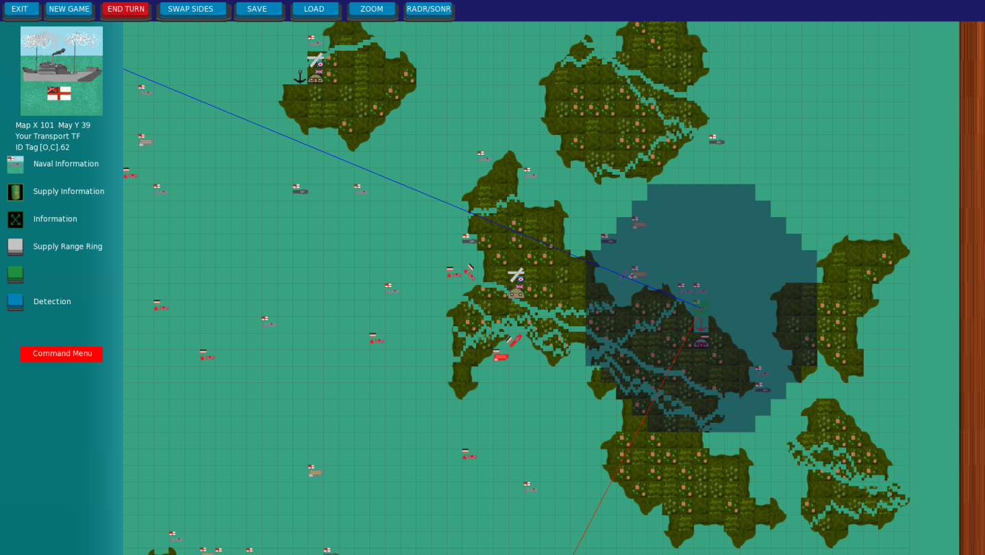 You drag Map around and use RADAR/SONAR Database to identify good targets, But Watch out for Air bases or enemy carriers , as their air units will defend there units. Try to sink the enemy transport ships as they supply bases, in turn the bases will supply ships. Ships repair and refuel at bases. You ca launch strategic bombers from bases and Para drops to disrupt enemy supply.