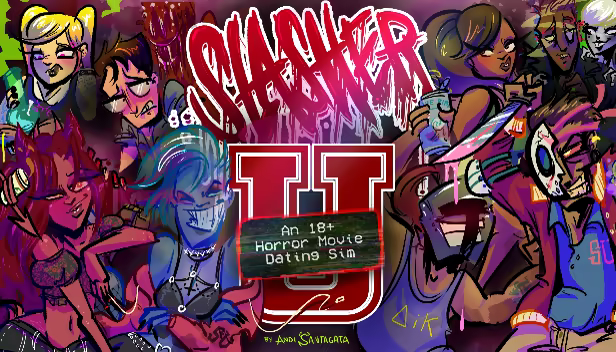 SLASHER U is a 90's inspired, 18+ reactive dating sim with (optionally toggleable) full-blown sex mechanics and minigames, an open-world explorable 2D map, a huge story-rich branching narrative based on dynamic Character Feelings systems, gothy y2k-inspired hand-drawn art, and TONS of balls-to-the-wall horror movie theming based on the vibrant history of horror from the 90's, 2000's, and beyond!