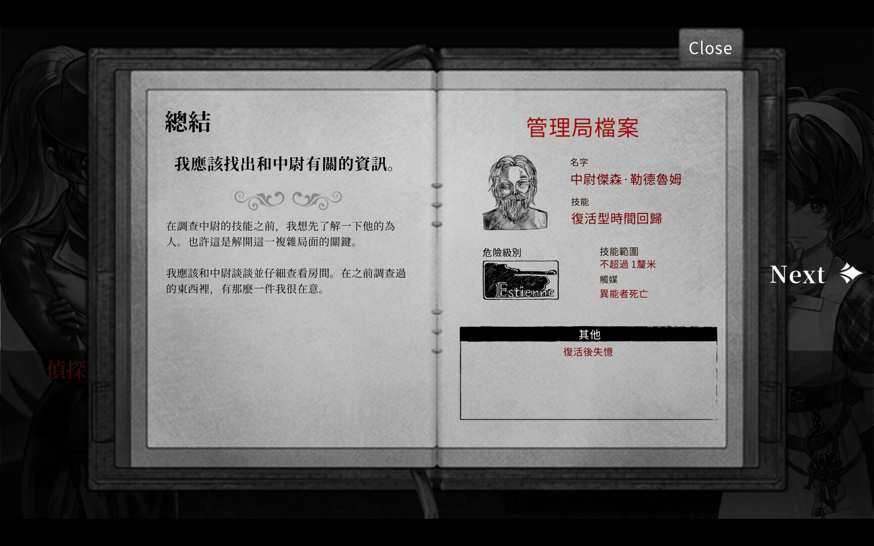 成功收集到全部資訊後,推理即可展開。務必要透徹了解中尉迄今為止的情況,並利用紀錄中的資訊抽絲剝繭,逐一查出背後的真相。