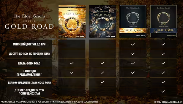 The Elder Scrolls Online Upgrade: Gold Road та The Elder Scrolls Online Deluxe Upgrade: Gold Road містять лише главу Gold Road, а також ігрові делюкс-предмети для тих, хто придбав Deluxe Upgrade: Gold Road.