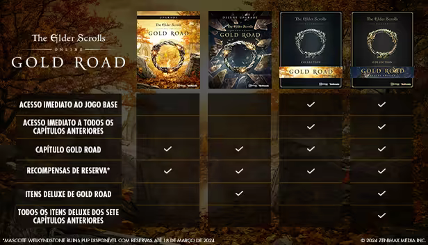 †Aqueles que adquirirem The Elder Scrolls Online Upgrade: Gold Road ou The Elder Scrolls Online Deluxe Upgrade: Gold Road receberão os itens do Capítulo Gold Road ou Deluxe e do Capítulo Gold Road, respectivamente. Essas versões não incluem os capítulos anteriores nem o jogo base.