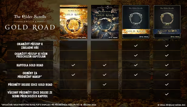 †Každý, kdo si zakoupí The Elder Scrolls Online Upgrade: Gold Road nebo The Elder Scrolls Online Deluxe Upgrade: Gold Road, obdrží kapitolu Gold Road – nebo kapitolu Gold Road a předměty edice Deluxe – tyto verze neobsahují předchozí kapitoly nebo základní hru.