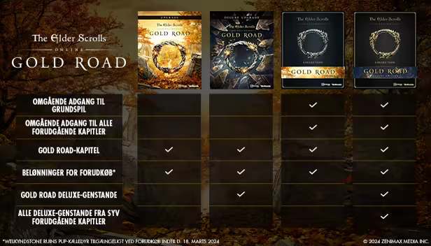 †Dem, der køber The Elder Scrolls Online Upgrade: Gold Road eller The Elder Scrolls Online Deluxe Upgrade: Gold Road, vil modtage henholdsvis Gold Road-kapitlet – eller Gold Road-kapitlet og Deluxe-genstande – disse versioner indeholder ikke de forudgående kapitler eller grundspillet.