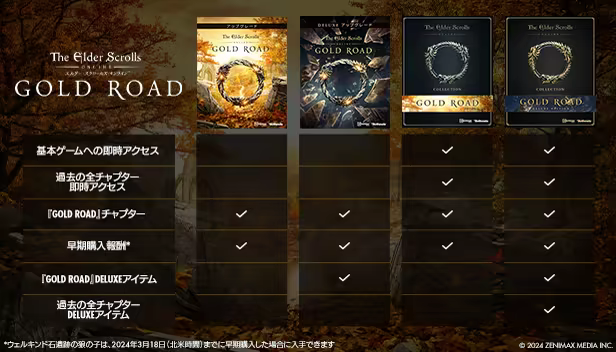 『The Elder Scrolls Online Collection: Gold Road』または『The Elder Scrolls Online Deluxe Collection: Gold Road』を購入すると、即座にすべての主要チャプターのゾーン、タムリエル中の生物、クエストにアクセスできます。『Collection: Gold Road』[i/]および『Deluxe Collection: Gold Road』にはゲーム本編、「Gold Road」、および以下の過去の全チャプター、(および『Deluxe Collection: Gold Road』購入者にはDeluxeアイテム)が含まれます。