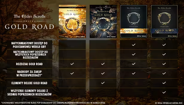 †Osoby, które kupią The Elder Scrolls Online: Rozszerzenie Gold Road lub The Elder Scrolls Online Rozszerzenie Deluxe: Gold Road otrzymają odpowiednio rozdział Gold Road lub rozdział Gold Road i elementy Deluxe – edycje te nie zawierają poprzednich rozdziałów ani podstawowej wersji gry.