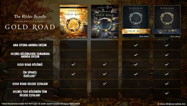 The Elder Scrolls Online Collection: Gold Road veya The Elder Scrolls Online Deluxe Collection: Gold Road sürümünü alarak tüm bölümlerin bölgelerine, biyomlarına ve Tamriel'in her köşesindeki görev serilerine erişebilirsin. Collection: Gold Road[i/] ve Deluxe Collection: Gold Road sürümlerine ana oyun, Gold Road ve aşağıda da listelenen tüm geçmiş bölümler dahildir. Deluxe Collection: Gold Road sürümünü alanları ayrıca Deluxe eşyalar da bekliyor.