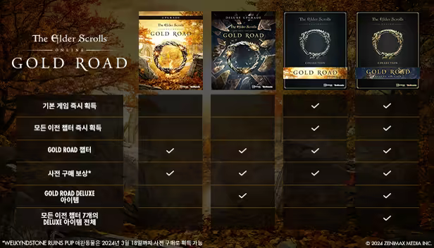 The Elder Scrolls Online Collection: Gold RoadThe Elder Scrolls Online Deluxe Collection: Gold Road에는 기본 게임, Gold Road, 모든 이전 챕터가 포함되어 있습니다. Deluxe Collection: Gold Road 구매자에게는 Deluxe 게임 내 아이템이 증정됩니다. 컬렉션 에디션 구매자는 바로 기본 게임이나 Gold Road, 혹은 이전 챕터에 뛰어들어 즐길 수 있습니다.