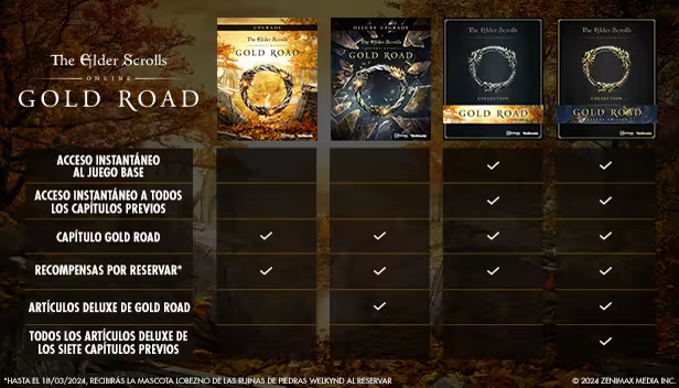 The Elder Scrolls Online Collection: Gold Road y The Elder Scrolls Online Deluxe Collection: Gold Road incluyen el juego base, Gold Road y todos los capítulos previos. Si compras Deluxe Collection: Gold Road, también recibirás también los objetos Deluxe en el juego. Quienes compren las ediciones Collection, podrán acceder de inmediato al juego base, a Gold Road o a cualquier capítulo previo.