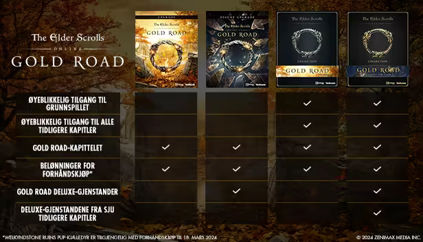 Kjøp The Elder Scrolls Online Collection: Gold Road eller The Elder Scrolls Online Deluxe Collection: Gold Road for å umiddelbart få tilgang til alle de tidligere kapittelsonene, biomene og oppdragshistoriene i Tamriel. Collection: Gold Road[i/] og Deluxe Collection: Gold Road inneholder grunnspillet, Gold Road alle de tidligere kapitlene, som oppført nedenfor (i tillegg til Deluxe-gjenstander for alle som skaffer seg Deluxe Collection: Gold Road).