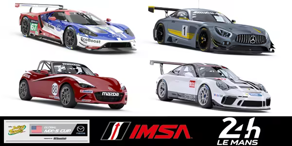 Ten Newly Rain-Ready Vehicles [ GT4 Class Cars (Aston Martin Vantage GT4, BMW M4 GT4, McLaren 570S GT4, Mercedes-AMG GT4, Porsche 718 Cayman GT4 Clubsport MR), Chevrolet Corvette Z06 GT3.R, Ford Mustang GT3, Global Mazda MX-5 Cup, Ligier JS P320, and Porsche 911 GT3 Cup (992)]