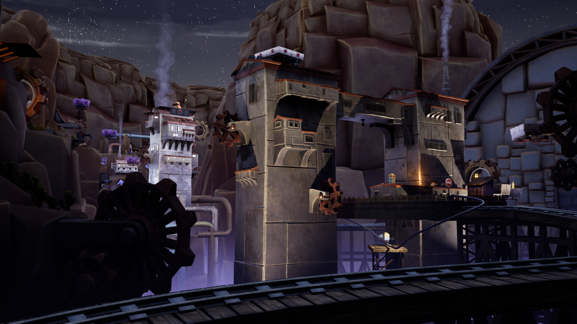 The tracks aren't what they used to be! Griffin must use all of his skills and tools available to him to get back home. He must scavenge, collect, and build to keep his train going. His train consists of a fast locomotive, a spacious storage car, and a versatile craft car that will help him build whatever he needs. Apart from the train, Griffin is agile and nimble. He can scurry up walls, grind on rails, and glide to where he needs to.