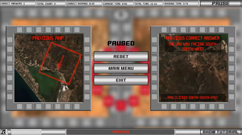 Included in the ASTB-E, this test measures and improves your ability to identify your compass-heading based on geographical features on a map. Similar to the Directional Orientation test, the left-hand screen shows a map with "NORTH" always being the top of the screen, and the right-hand screen is your view of the ground from the "cockpit" of an aircraft, with your heading/forward-direction always being the top of the screen. You must determine the compass-heading of your aircraft by cross-referencing geographical features from the right-hand "Heading" screen with the position and orientation of those same features on the left-hand "Map" screen.