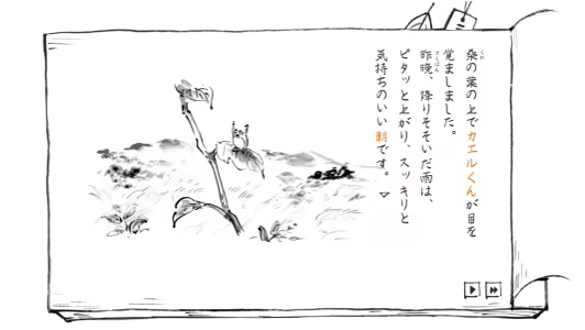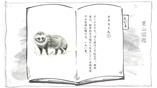 "Satoyama note: natsukusa komichi" is a novel game about the creatures that live in satoyama. Collect illustrated books and take the quiz-style satoyama test. The background music is played live by a shinobue flute, and the world is depicted by hand-drawn ink paintings.