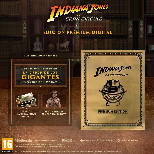 Disfruta de la aventura con la Edición Prémium, que incluye la expansión de historia Indiana Jones y el Gran Círculo™: La Orden de los Gigantes, un libro de ilustraciones digital y la vestimenta El templo maldito™, la emblemática apariencia de Indy que se podía ver en El templo maldito™.