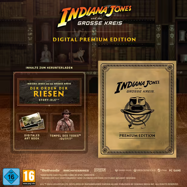 Stürz dich mit der Premium Edition ins Abenteuer und erhalte den Story-DLC „Indiana Jones und der Große Kreis™: Der Orden der Riesen“, ein digitales Artbook und das „Tempel des Todes™“-Outfit aus Indiana Jones und der Tempel des Todes™.