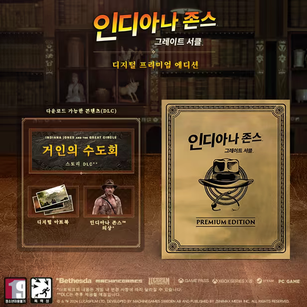 실물 프리미엄 에디션을 구매하면 기본 게임과 인디아나 존스: 그레이트 서클™ 거인의 수도회 스토리 DLC, 디지털 아트북 및 영화 마궁의 사원™에 등장하는 인디아나의 상징적인 마궁의 사원™ 의상과 함께 모험을 즐길 수 있습니다.