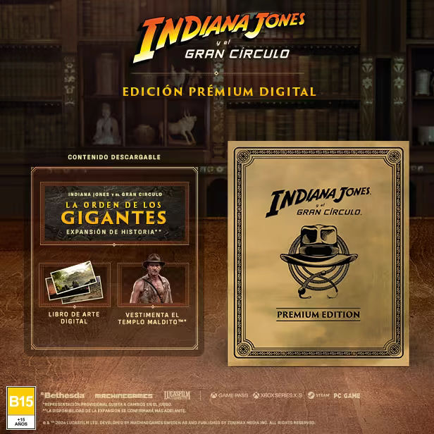 Disfruta de la aventura con la Edición Prémium, que incluye la expansión de historia Indiana Jones y el Gran Círculo™: La Orden de los Gigantes, un libro de ilustraciones digital y la vestimenta El templo maldito™, la emblemática apariencia de Indy que se podía ver en El templo maldito™.