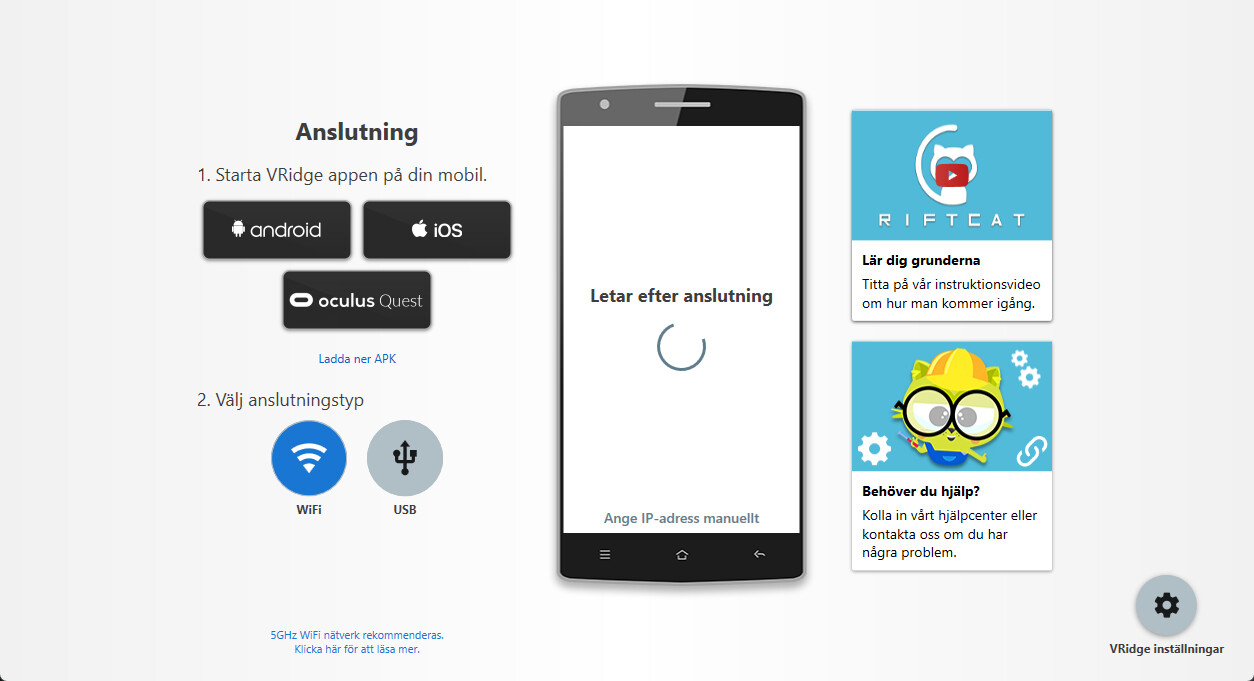 4. Följ de inbyggda instruktionerna i RiftCat-applikationen för att ansluta dem via WiFi.