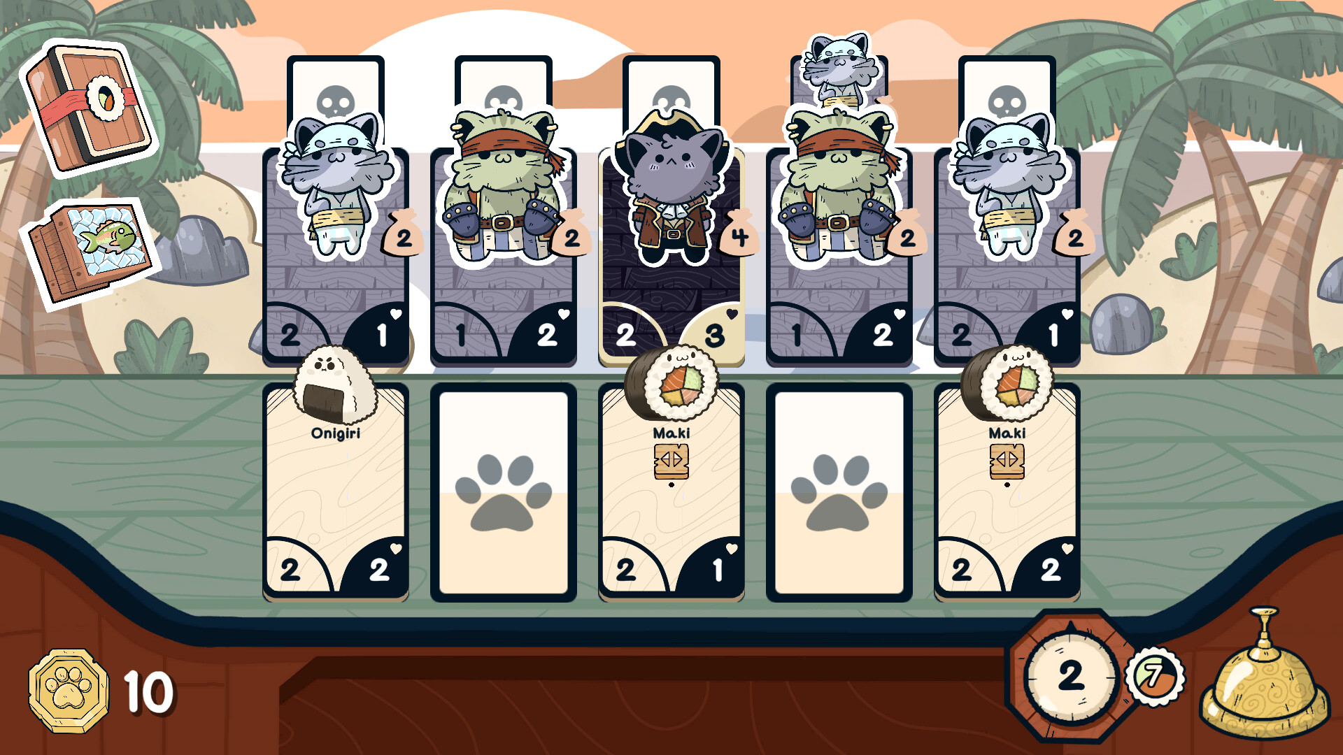 Choppy Waters is a quirky, sushi-themed roguelite deckbuilder. Gather fresh ingredients, craft powerful sushi cards, and engage in turn-based tactical battles as you navigate a procedurally generated map. Discover clever synergies to outwit pirates, cultists, and all manner of monstrous foes!