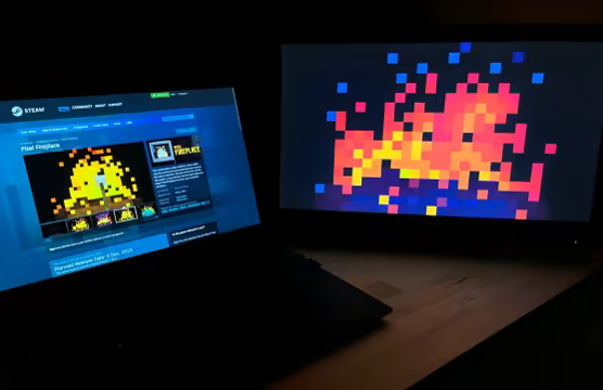 Run Pixel Fireplace on a second monitor while you work. Double-click to switch to windowed mode, then drag the window to another screen and double-click again for fullscreen.