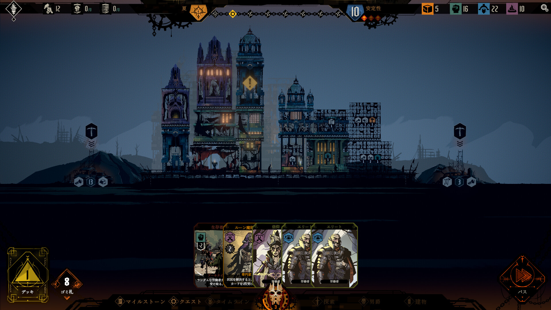 配られたカードは慎重に使いましょう。各ターンはあなたが生き残ったシーズンを表し、安定度が残っている間は民の生活も安泰です。ですが、この値が0になると、ゲームオーバーとなります。