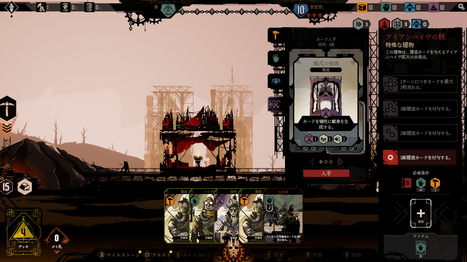 Ironhive(アイアンハイヴ)は、終末へと近づく世界で生き残っていくデッキビルディング型戦略ゲーム。植民地を構築していき、自分の民の生存を確保しながら、次の世代へと引き継がれる遺産を作り上げていきます。アイアンロード(鉄の領主)であるあなたが、民にとって唯一の希望なのです。
