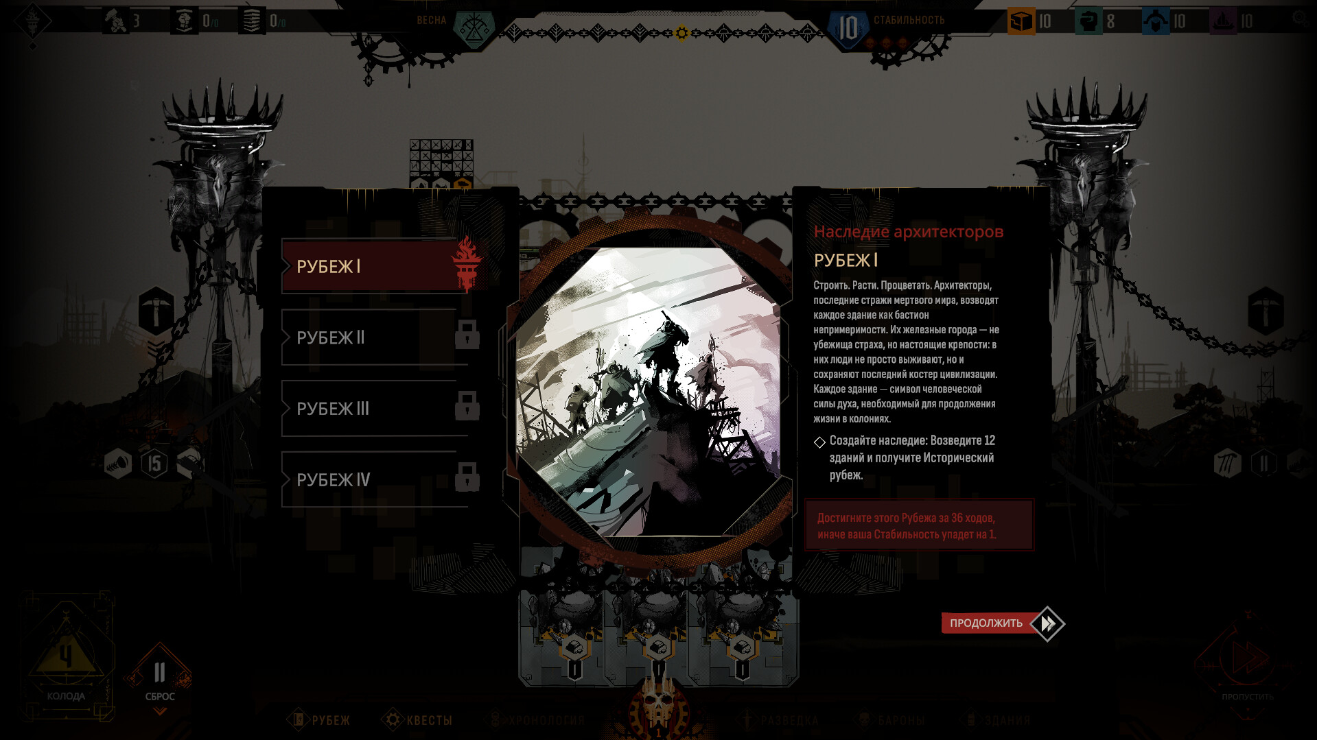 Используйте выпавшие вам карты с умом. Каждый ход — это один сезон, который вы пережили. Пока у вас не закончилась Стабильность, надежда еще есть. Если она достигнет нуля, — всё кончено.