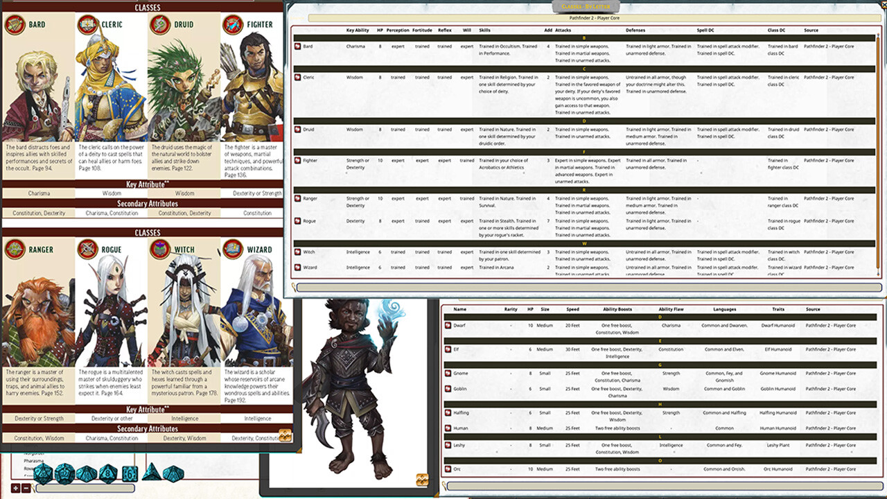 • Complete character creation rules, walking you through building a character by selecting your Ancestry, Background, and Class, with a focus on the bard, cleric, druid, fighter, ranger, rogue, witch, and wizard! Core ancestry options include human, dwarf, elf, gnome, goblin, halfling, leshy, and orc!