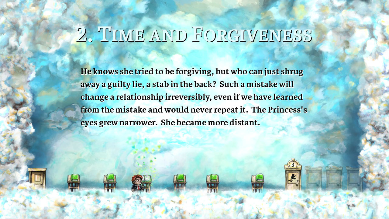 Braid is a puzzle-platformer, drawn in a painterly style, where you can manipulate the flow of time in strange and unusual ways. From a house in the city, journey to a series of worlds and solve puzzles to rescue an abducted princess. In each world, you have a different power to affect the way time behaves, and it is time's strangeness that creates the puzzles. The time behaviors include: the ability to rewind, objects that are immune to being rewound, time that is tied to space, parallel realities, time dilation, and perhaps more.