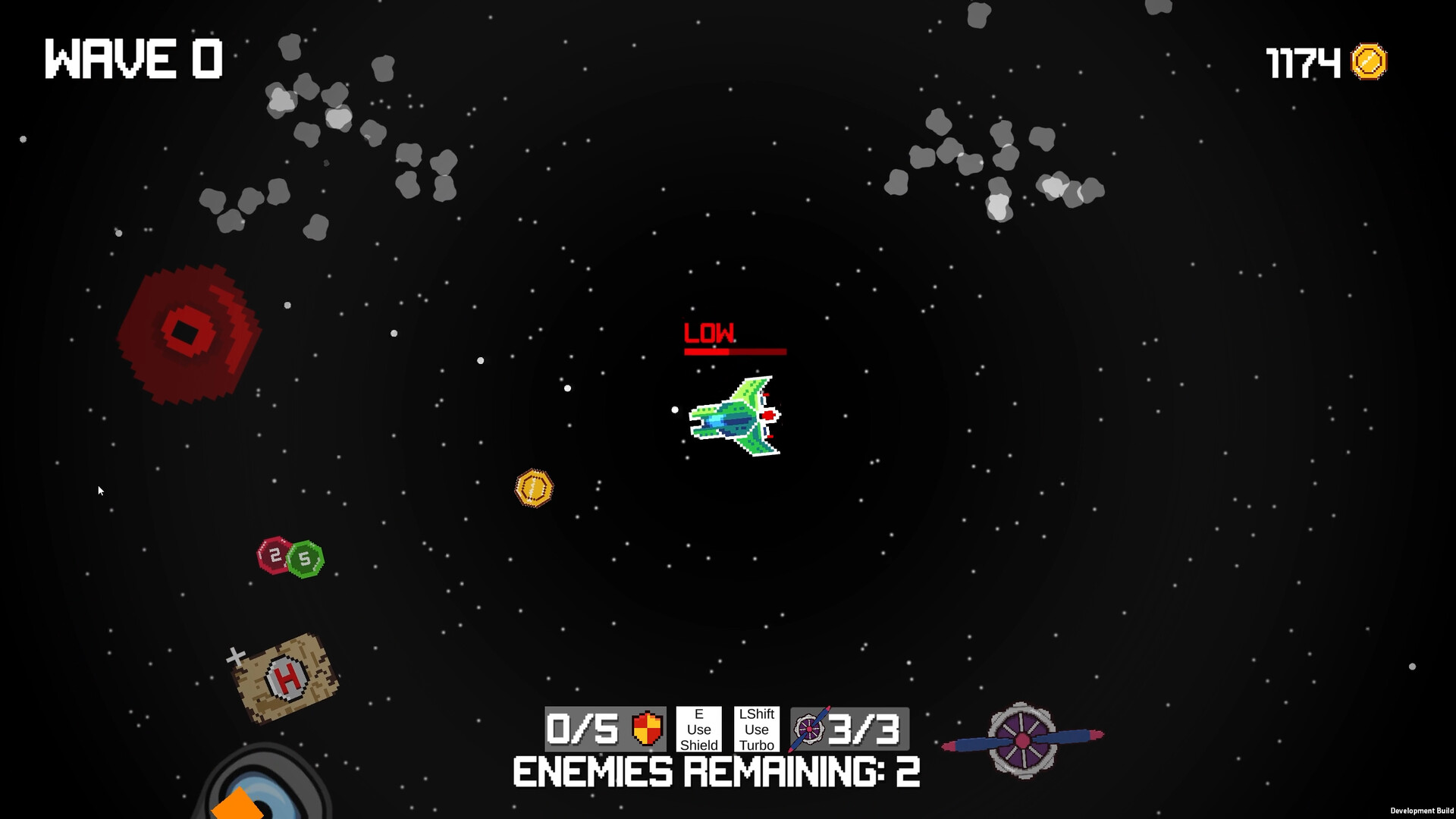 Wave-based top-down shooter with between-wave (per-run) upgrades and meta progression. After each wave, pick one of three tiered upgrades that stack into a build. Use Turbo to reposition, Shield to survive, and spend coins on permanent ship upgrades.
