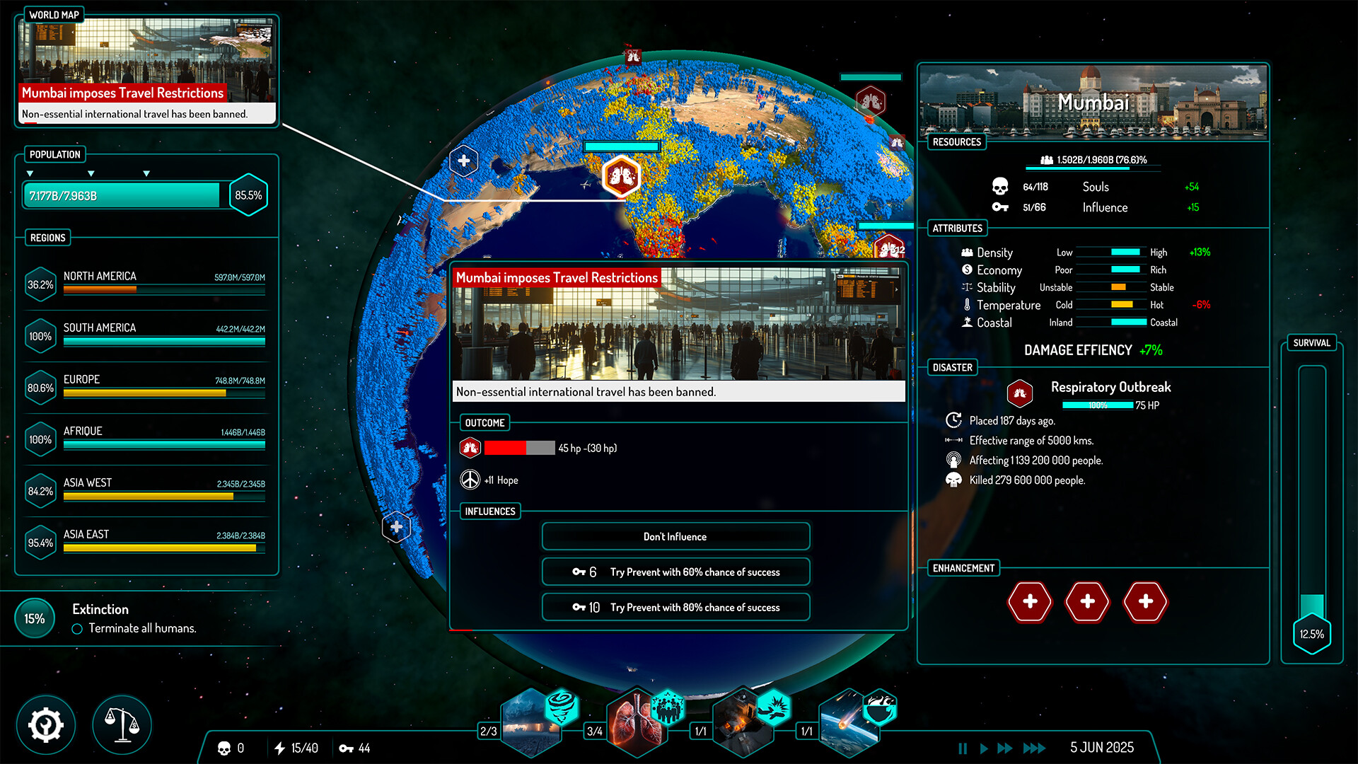 Watch disasters unfold in real-time, dynamically evolving and spreading based on your strategic choices. Combine different disasters to create chain reactions and watch civilization collapse before your eyes. Humanity won't go down without a fight.