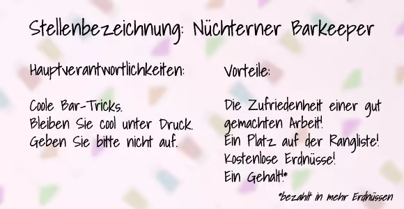 Wir hatten nicht viel Glück, kompetentes Barpersonal einzustellen, aber ich habe das Gefühl, dass Sie der Richtige für den Job sind. Halten Sie das Bier bestückt, die Spirituosen fließend und die Kunden fröhlich. Oh, und wenn Sie einen Fehler machen, wird es von Ihrem Gehalt abgezogen. Es wird ziemlich geschäftig, also bleiben Sie auf den Zehen und lassen Sie sich nicht durcheinander bringen. In Ordnung? Willkommen im Team.