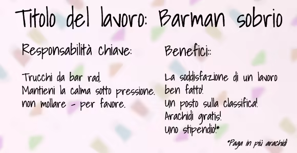 Non abbiamo avuto molta fortuna nell’assumere personale di bar competente, ma ho la sensazione che tu sia la persona giusta per il lavoro. Mantieni la birra rifornita, gli spiriti che scorrono, e i clienti allegri. Oh, e se combini un pasticcio, verrà detratto dal tuo stipendio. È piuttosto affollato, quindi stai attento e non confonderti. Va bene? Benvenuto nel team.