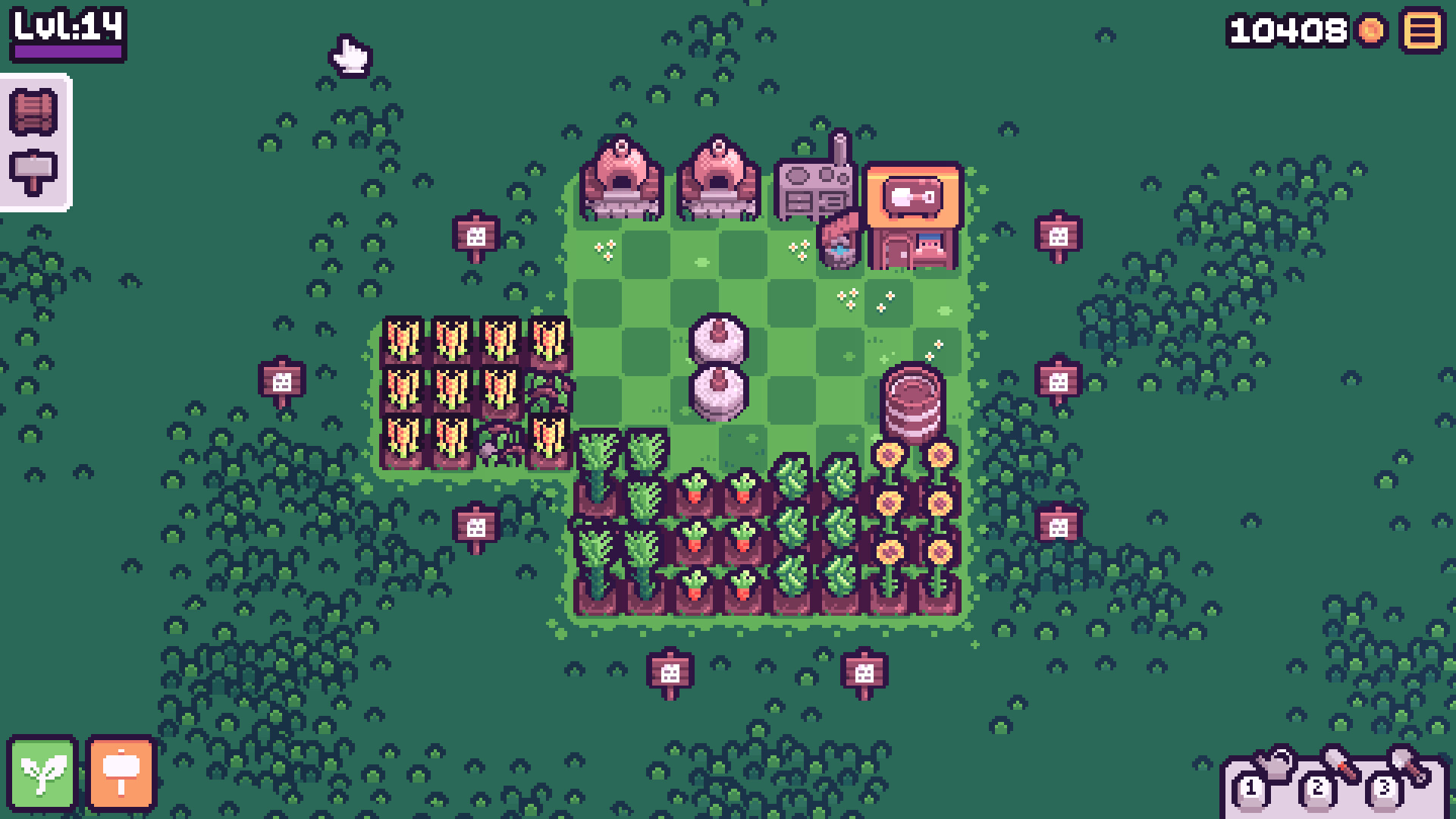 Ernte und produziere Gegenstände, um Geld und Erfahrung zu sammeln. Steige im Level auf, um neue Samen und Maschinen freizuschalten.