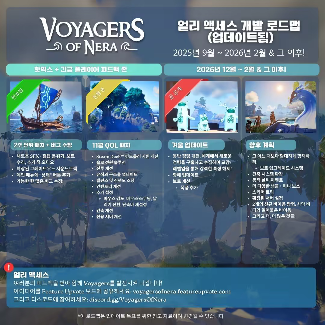 “Voyagers를 위한 큰 계획이 있으며, 얼리 액세스를 떠나기 전에 추가할 것이 많습니다! 얼리 액세스 출시 시 앞으로의 계획을 담은 로드맵을 공유하고 개발 기간 동안 계속 업데이트할 예정입니다. 새로운 섬, 자원, 적, 퀘스트로 가득한 완전히 새로운 생태계 등 추가할 콘텐츠가 많습니다. 또한 새로운 아이템, 의상, 생물도 출시하여 여러분의 섬 기지를 계속 발전시킬 수 있게 할 예정입니다!”
