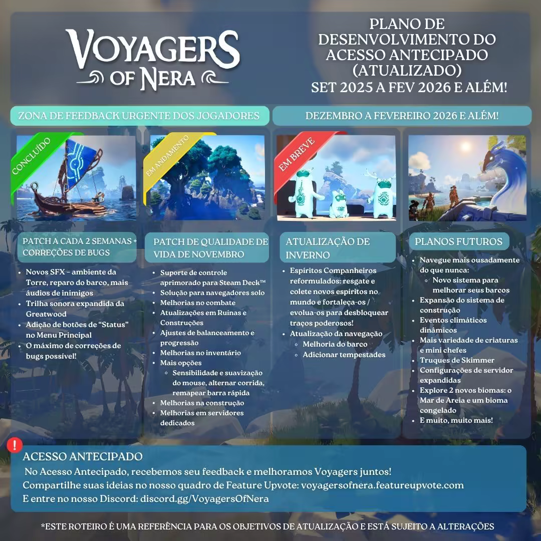 "Temos grandes planos para Voyagers e muito a adicionar antes de estarmos prontos para deixar o Acesso Antecipado! Quando lançarmos o Acesso Antecipado, também compartilharemos um roteiro do que está por vir e o manteremos atualizado durante todo o desenvolvimento. Há uma tonelada de coisas que planejamos adicionar, como novos biomas para explorar, cheios de novas ilhas, recursos, inimigos e missões. Também planejamos lançar novos itens, roupas e criaturas para que você possa continuar expandindo suas bases nas ilhas!"