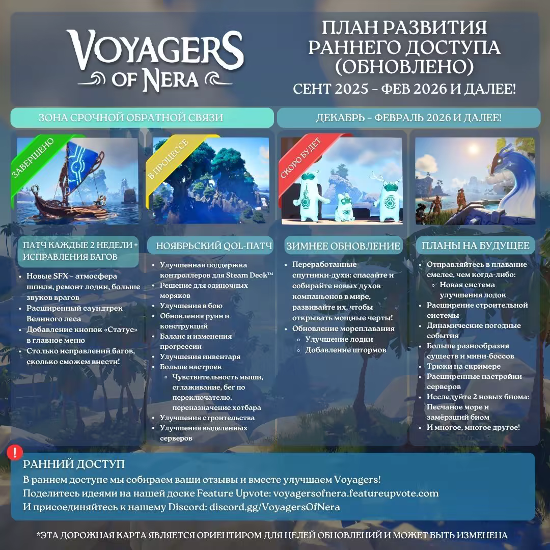 «У нас большие планы на Voyagers и много чего нужно добавить, прежде чем мы будем готовы покинуть Ранний доступ! Когда мы запустим Ранний доступ, мы также поделимся дорожной картой предстоящих обновлений и будем поддерживать её актуальность на протяжении всей разработки. Мы планируем добавить множество нового контента, например, совершенно новые биомы для исследования с новыми островами, ресурсами, врагами и заданиями. Мы также планируем выпустить новые предметы, одежду и существ, чтобы вы могли продолжать развивать свои островные базы!»