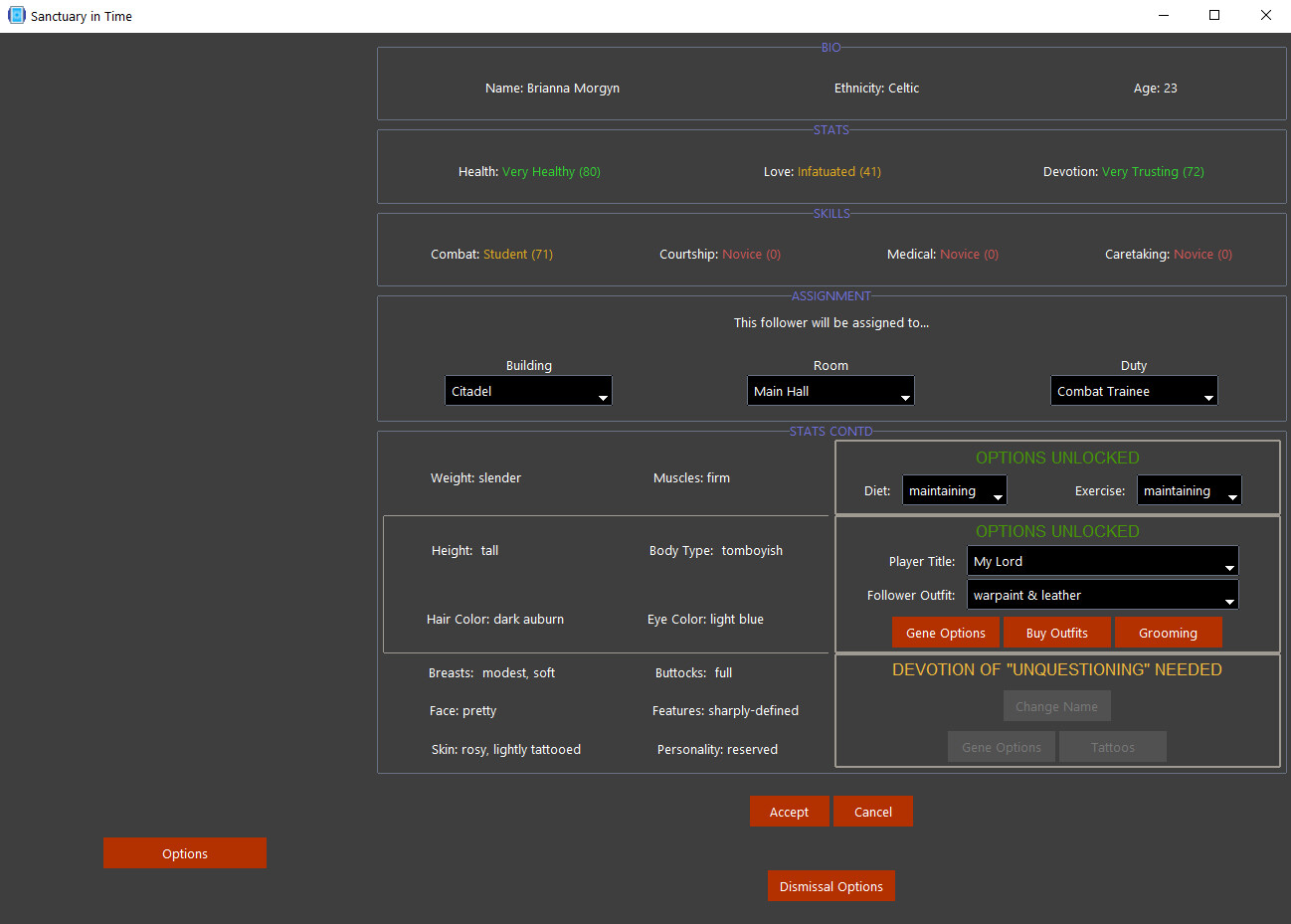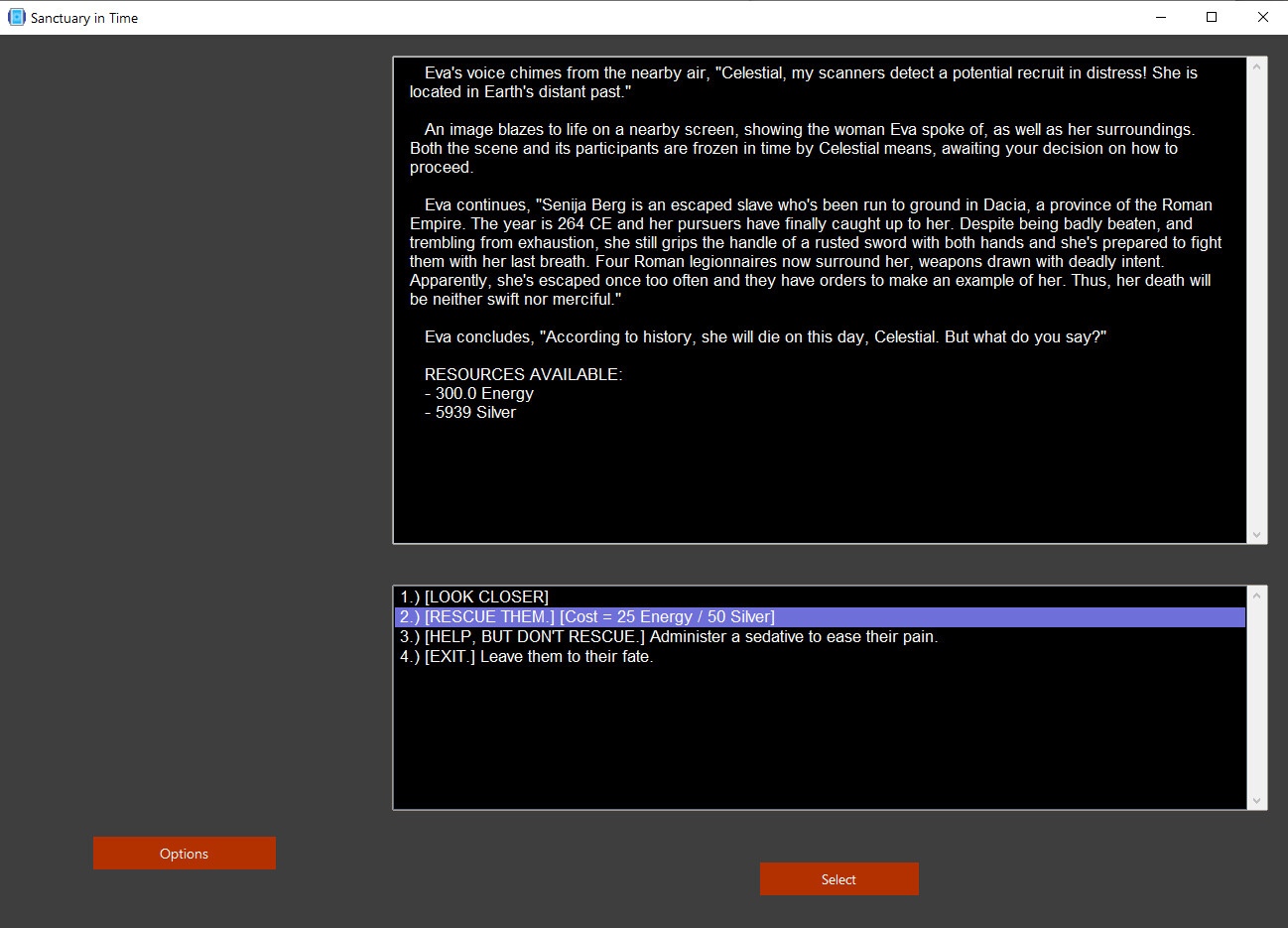 MATURE CONTENT WARNING: Sanctuary in Time is a game intended for mature audiences of 18 years of age or older. This game contains frank depictions of nudity, sex, violence, and death in a text-based format (i.e. no images/visual depictions).