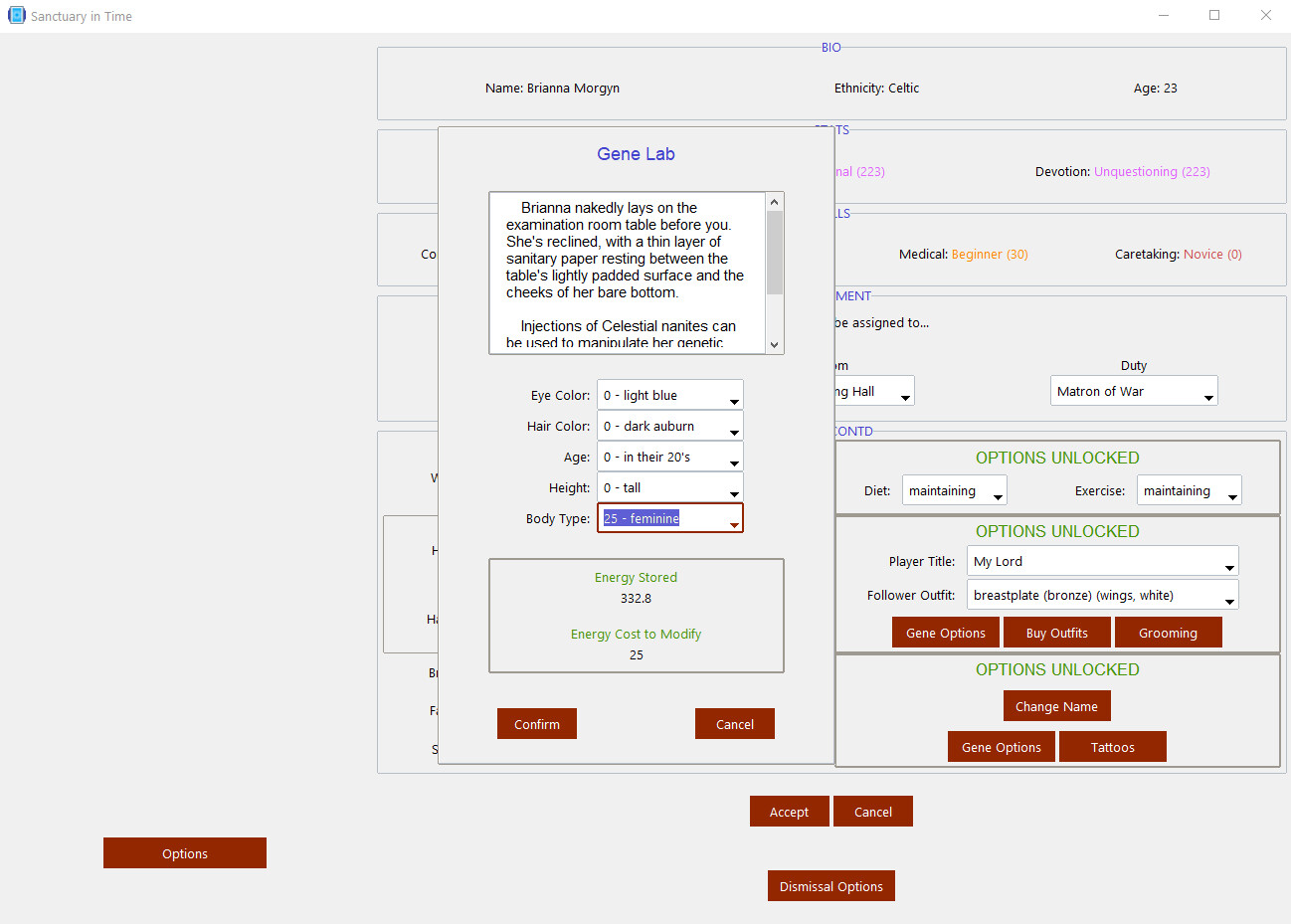 Content: m/f, voyeurism, oral, anal, female masturbation, female muscle growth, genetic manipulation, female body hair, player as god.