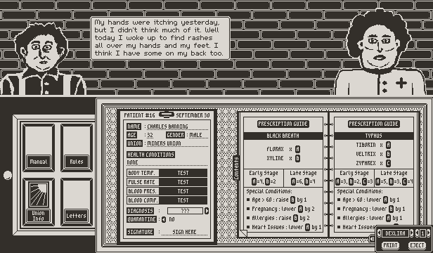 The city of Grimchester is looking for doctors. In this atmospheric job simulator, read patients' conditions, diagnose their diseases and prescribe accordingly. Manage your relationships with unions and build your reputation in the city, all the while managing your finances.