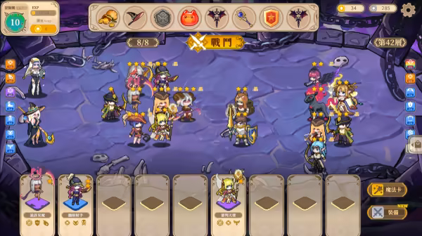 為隨從們添加裝備增強,不同的裝備、聖物及角色羈絆組合會產生各種連鎖協同效果。戰鬥時使用適當的魔法卡,可以在場外幫助隨從戰鬥。