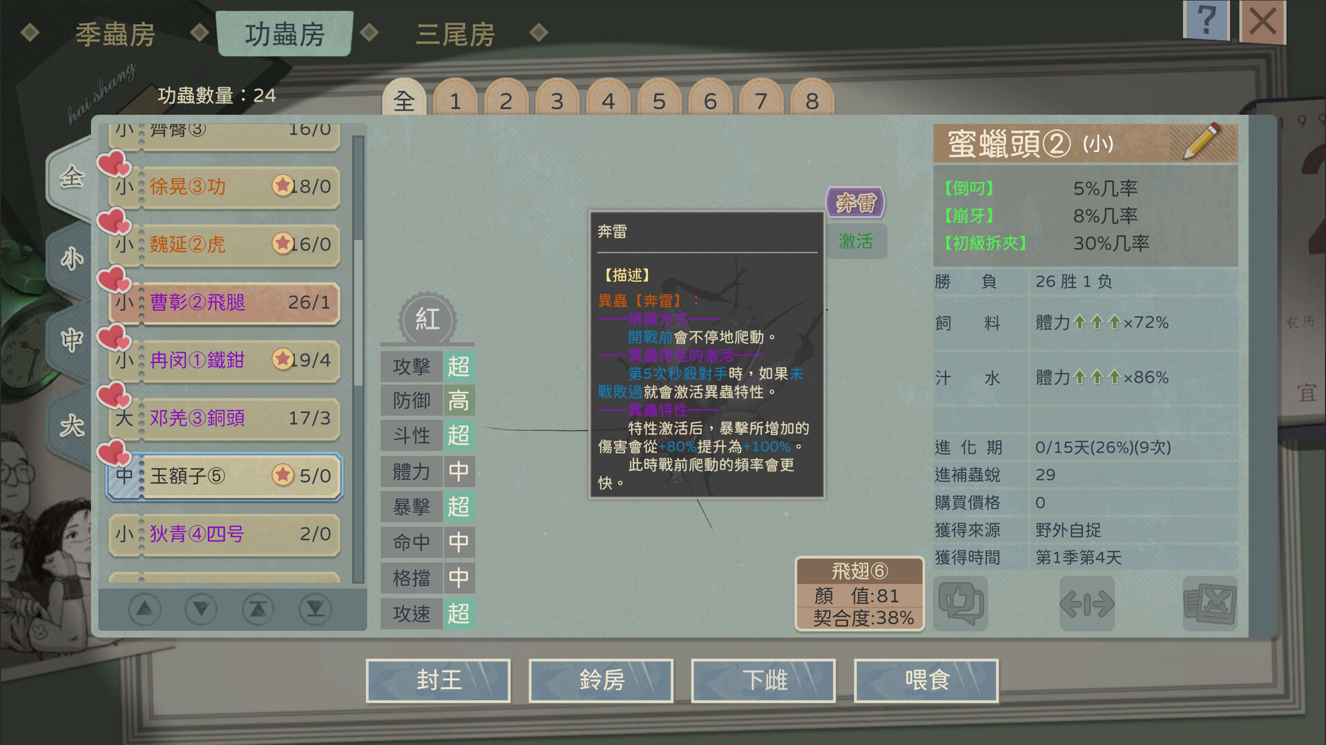 • 老饞是一種貪吃的異蟲。能吃是福,它們的初始體力為9檔,且餵食吸收度總是不低於90%,在進補時,它的胃口和其他蟋蟀也大不相同。