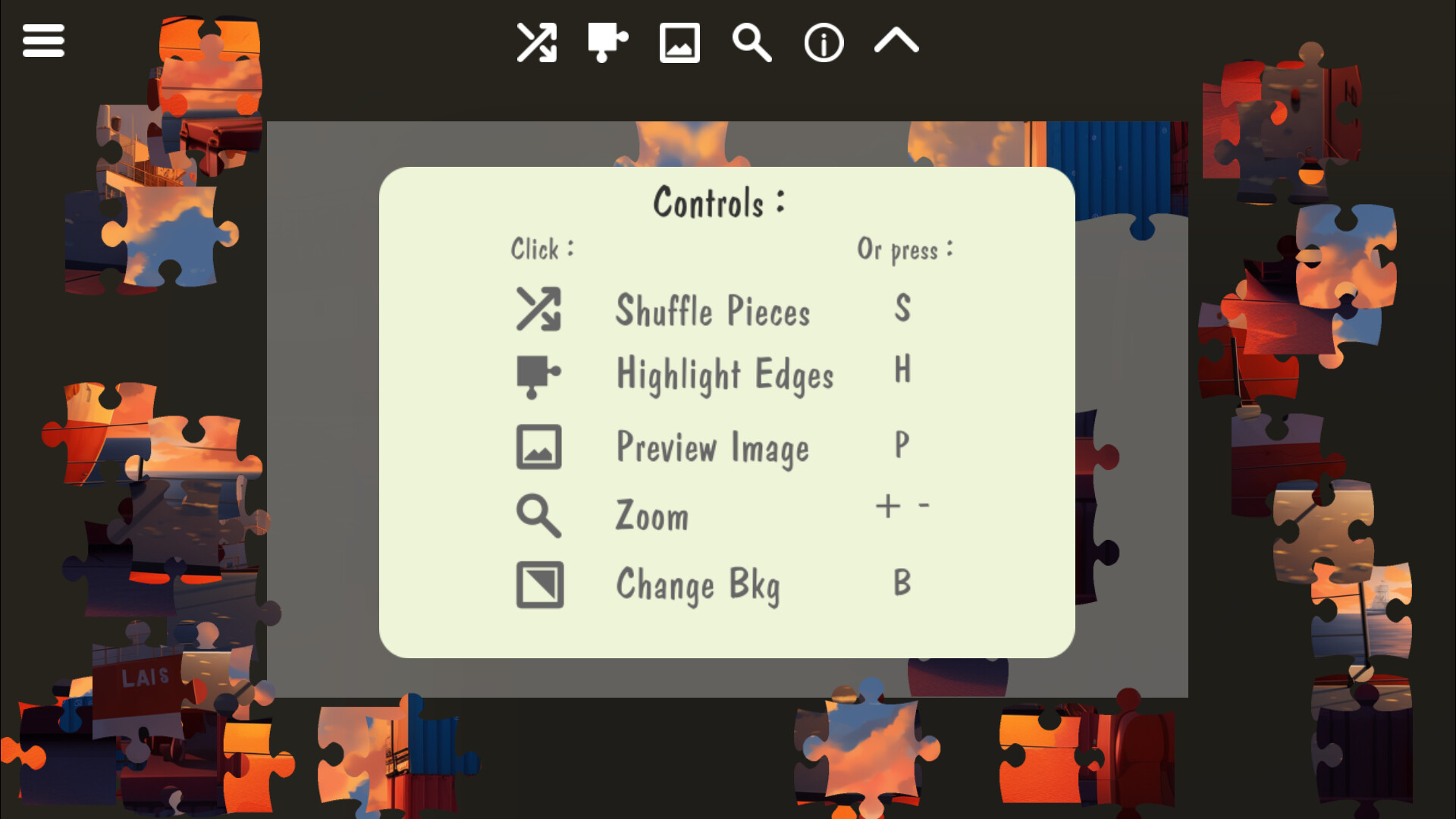 • Complete 6 Jigsaw Puzzle scenes at 5 levels of dificulty.