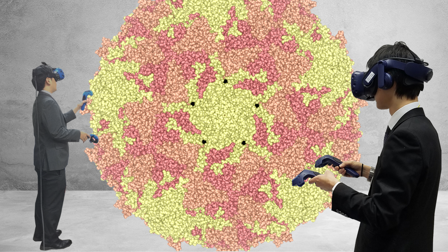 MolCollabo is software that enables the 3D display of biomolecules such as proteins and nucleic acids on a head-mounted display, allowing for a virtual reality (VR) experience. By connecting VR spaces through network communication, the displayed molecular structures can be shared and viewed by multiple people, including those in remote locations. This facilitates communication with researchers engaged in structural analysis and molecular simulations. Additionally, the software allows for configuration and operation solely through a PC screen.