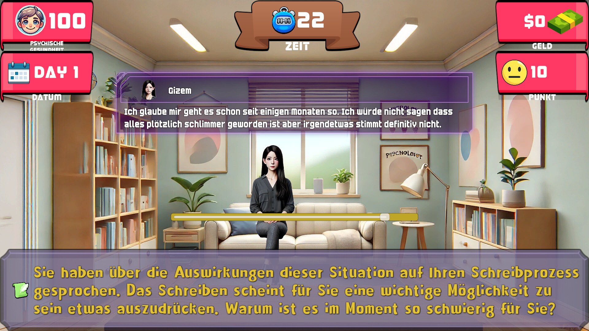 Therapist Simulator nimmt Sie mit auf eine Reise in die Tiefen des menschlichen Geistes. Können Sie das Vertrauen Ihrer Patienten gewinnen? Können Sie ihre verborgenen Geschichten aufdecken? Können Sie Ihre psychische Gesundheit und Ihre Karriere aufrechterhalten?