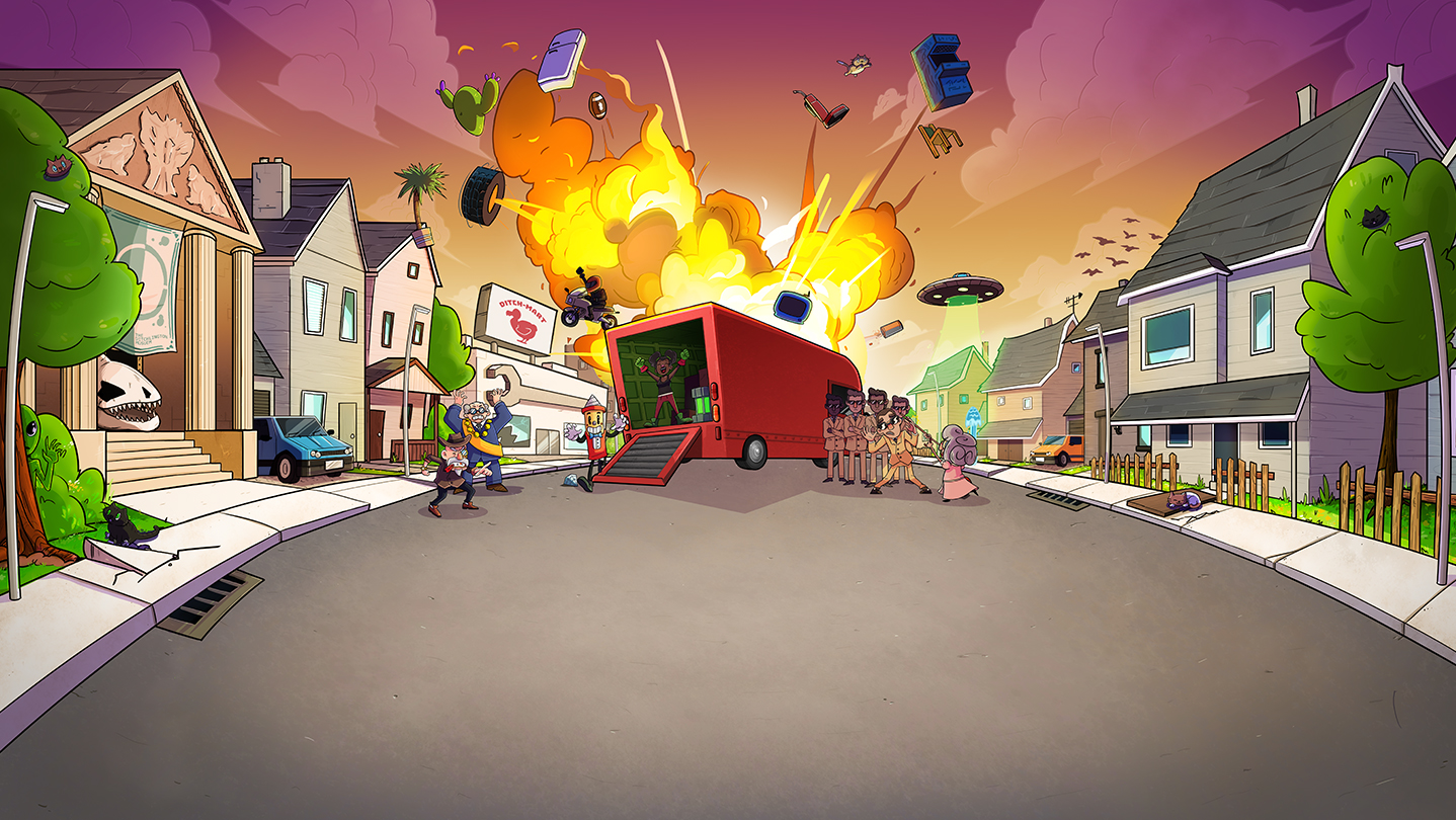 With little time and even less caution, your ragtag removals team gets to work rapidly relocating the entire town… leaving a trail of destruction, explosions, and debris in your wake!