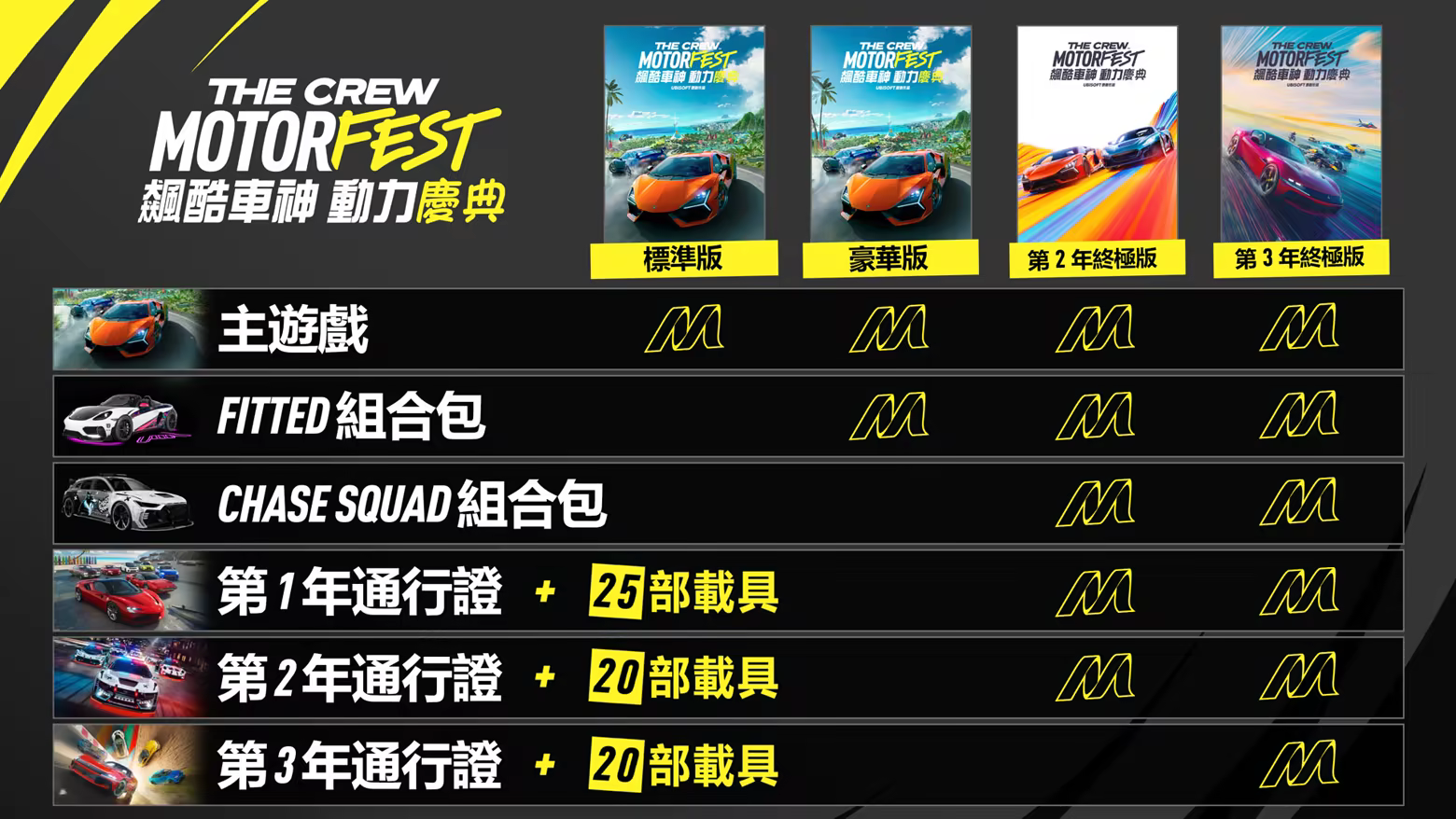 - Chase Squad 體驗:於新遊玩清單追捕目標,接下新的開放世界挑戰。阻止所有對手,解鎖 7 款獨家 Chase Squad 載具:6 款車輛以及 1 台直升機,附帶獨特自訂內容。閃光燈、底盤燈、特殊烤漆——工具在手,加入 Motorfest 守護者的行列吧。