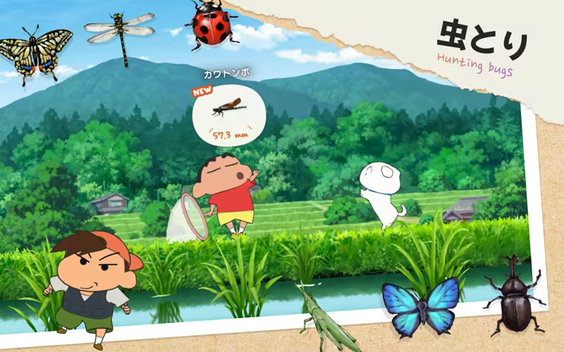 祖父の銀の介から虫とりや魚釣りなど、田舎遊びの極意を教えてもらうしんのすけ。