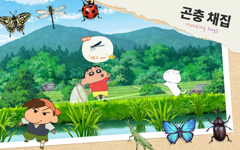 돌식으로부터 곤충 채집이나 물고기 낚시 등 시골 생활의 비법을 전수 받는 짱구.