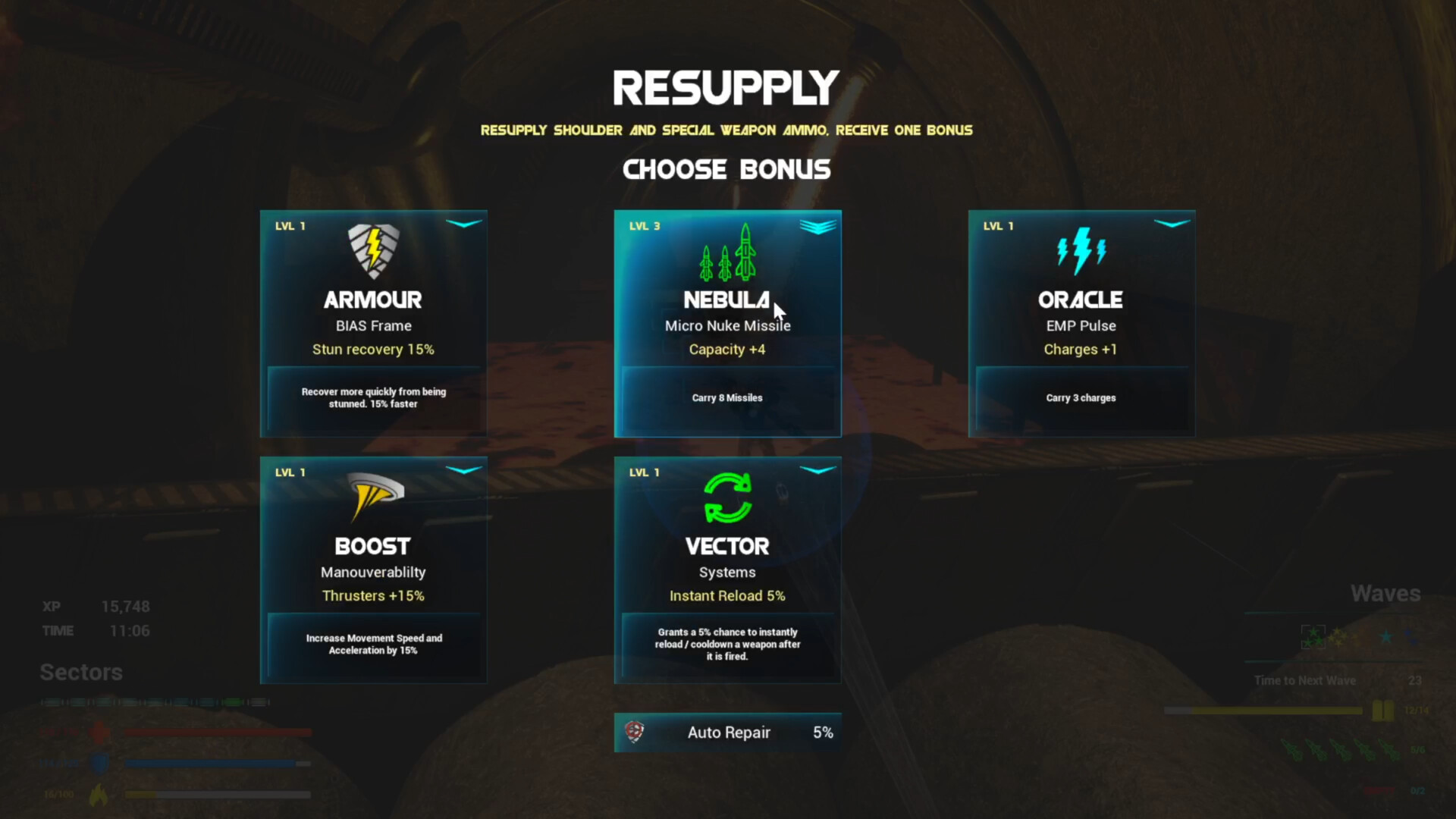 After being shot down, your Vector can be repaired and enhanced for another attempt. Every run is unique, the path you choose as you speed through various procedurally generated environments will determine the foes and conditions you face and the rewards you gain.